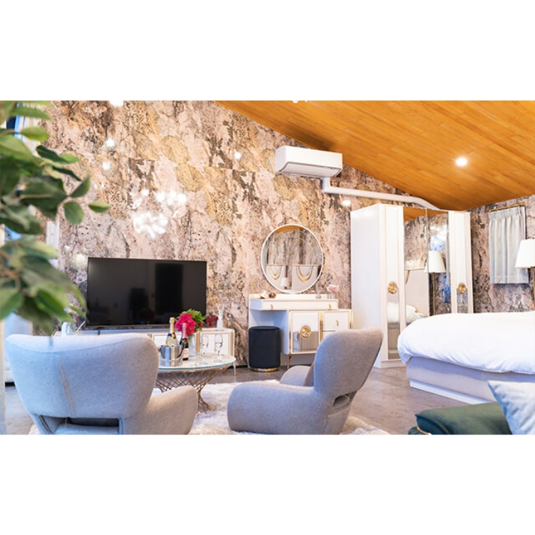 ゴージャスなトルコ家具に囲まれ、海を眺めながらの浴室や、プライベートテラスや焚き火台、ジャグジーまで設備された客室も。