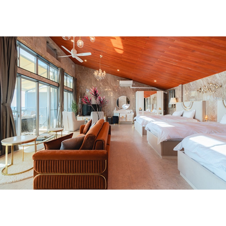 ゴージャスなトルコ家具に囲まれ、海を眺めながらの浴室や、プライベートテラスや焚き火台、ジャグジーまで設備された客室も。