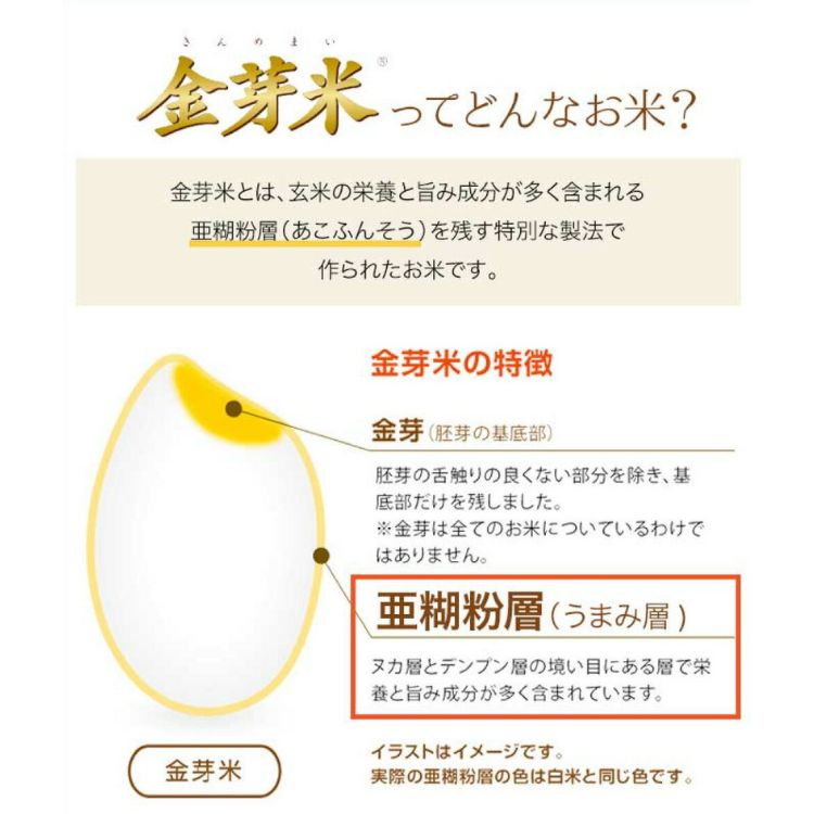 東洋ライス独自の精米技術により、胚芽の舌触りの良くない部分を除いた胚芽の基底部「金芽(きんめ)」と、