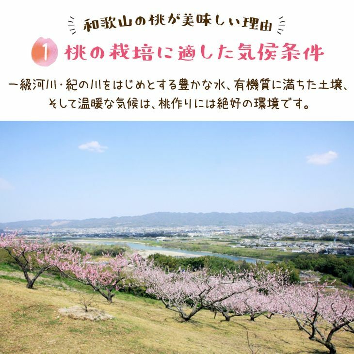 全国でも有数の桃の産地和歌山県 その和歌山の桃は甘い香りと、とってもみずみずしい果汁たっぷりの暑い季節に体を癒してくれるフルーツです。一口、口にすると甘い香りととろけるような甘みが口いっぱいに広がります。こだわりの桃農家さんが一生懸命作り上げた初夏から夏にかけて旬のこだわりのフルーツ王国和歌山の桃を是非ご賞味ください。