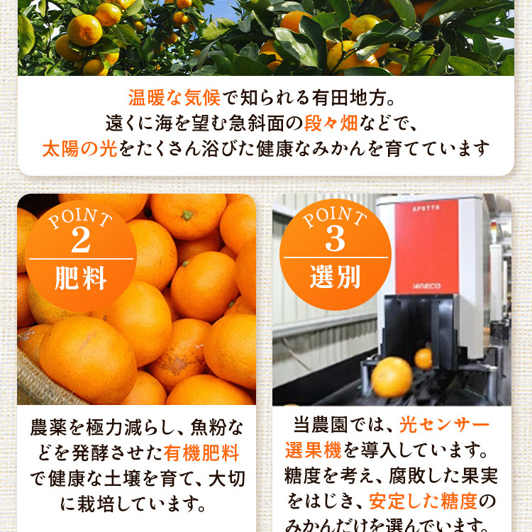 乾燥した気候の中、急峻な段々畑で、黒潮の浜風をうけて育った有田みかんは、果汁がギューッと濃縮されて濃厚な味わいです。