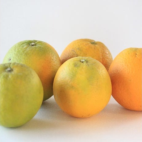 バレンシアオレンジは、黄色くなったあと緑色にもどる「回青現象」と呼ばれる現象が起こる場合がございますが緑色でも完熟です。