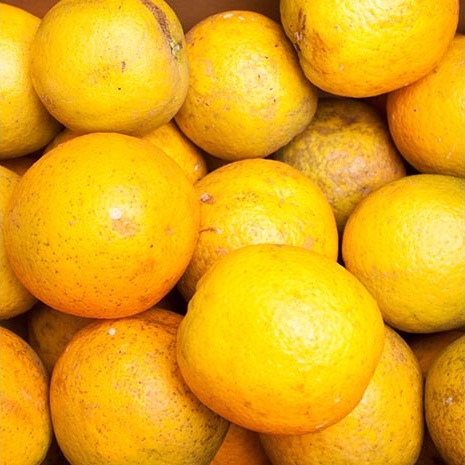 バレンシアオレンジは、黄色くなったあと緑色にもどる「回青現象」と呼ばれる現象が起こる場合がございますが緑色でも完熟です。