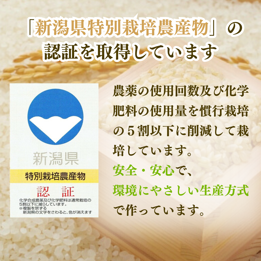 農薬の使用回数及び化学肥料の使用量を通常の5割以下に削減して栽培しており「新潟県特別栽培農産物」の認証を取得しています。