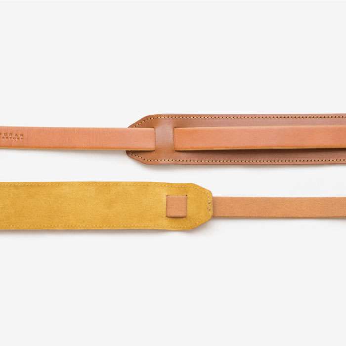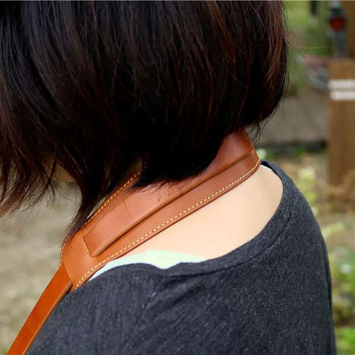 一眼レフなど重いカメラの肩への負担を軽減する大きな肩当て。表面はナチュラルな質感の植物性タンニン鞣しの革ですが、裏面は肩にかけた時に滑りにくいピッグスエードを使用しています。