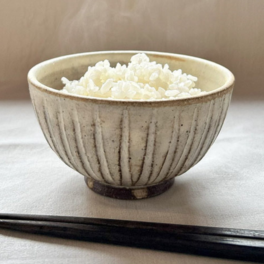 外側に施したしのぎ紋、丸みのある形状と安定感のある高台で持ちやすく、使いやすい飯碗です。
