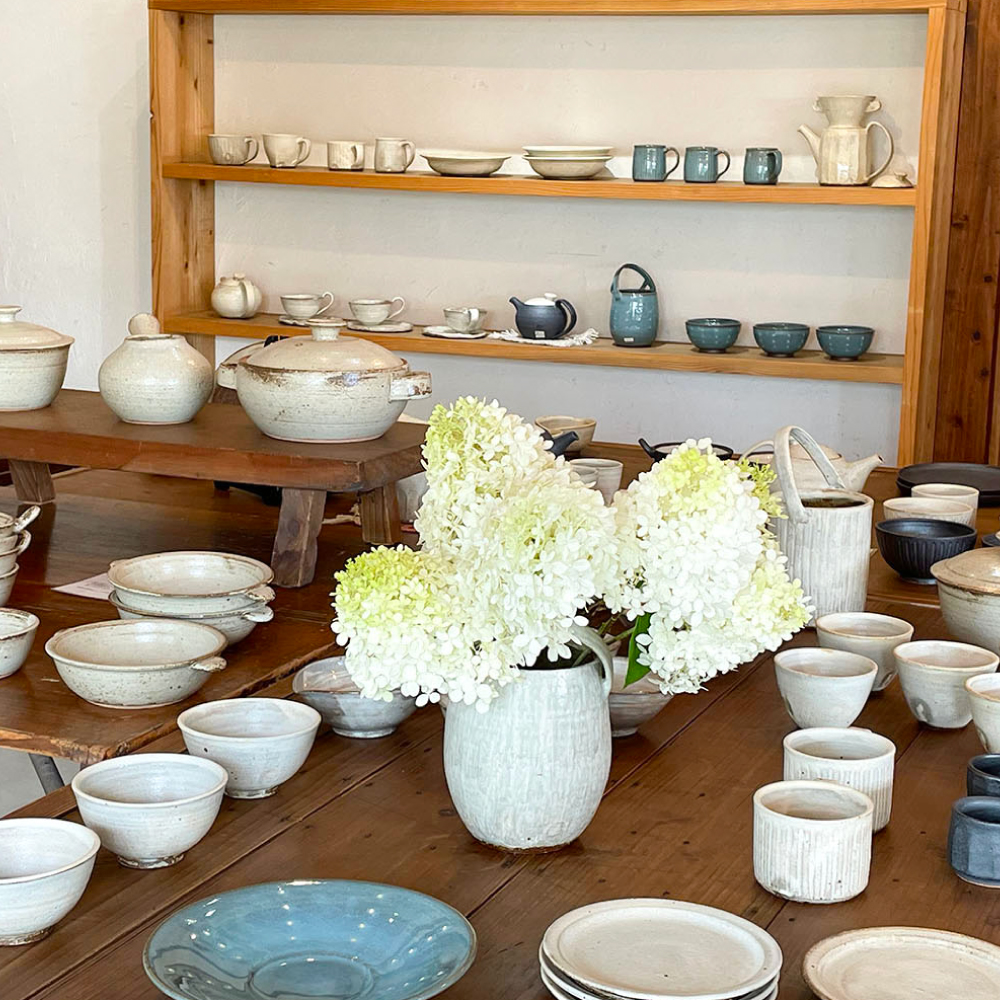 平成23年より現在地にて、「うつわと手仕事の店 研」をオープンしました。 私たちが、全国の手作りですばらしいものを作っている作家と知り合い、刺激を受けていき、ぜひその方たちの作品を知ってほしいという思いから、このお店を始めました。ガラスや、布物、木工フェルトなど様々なジャンルの物を取り揃えて、展示しています。