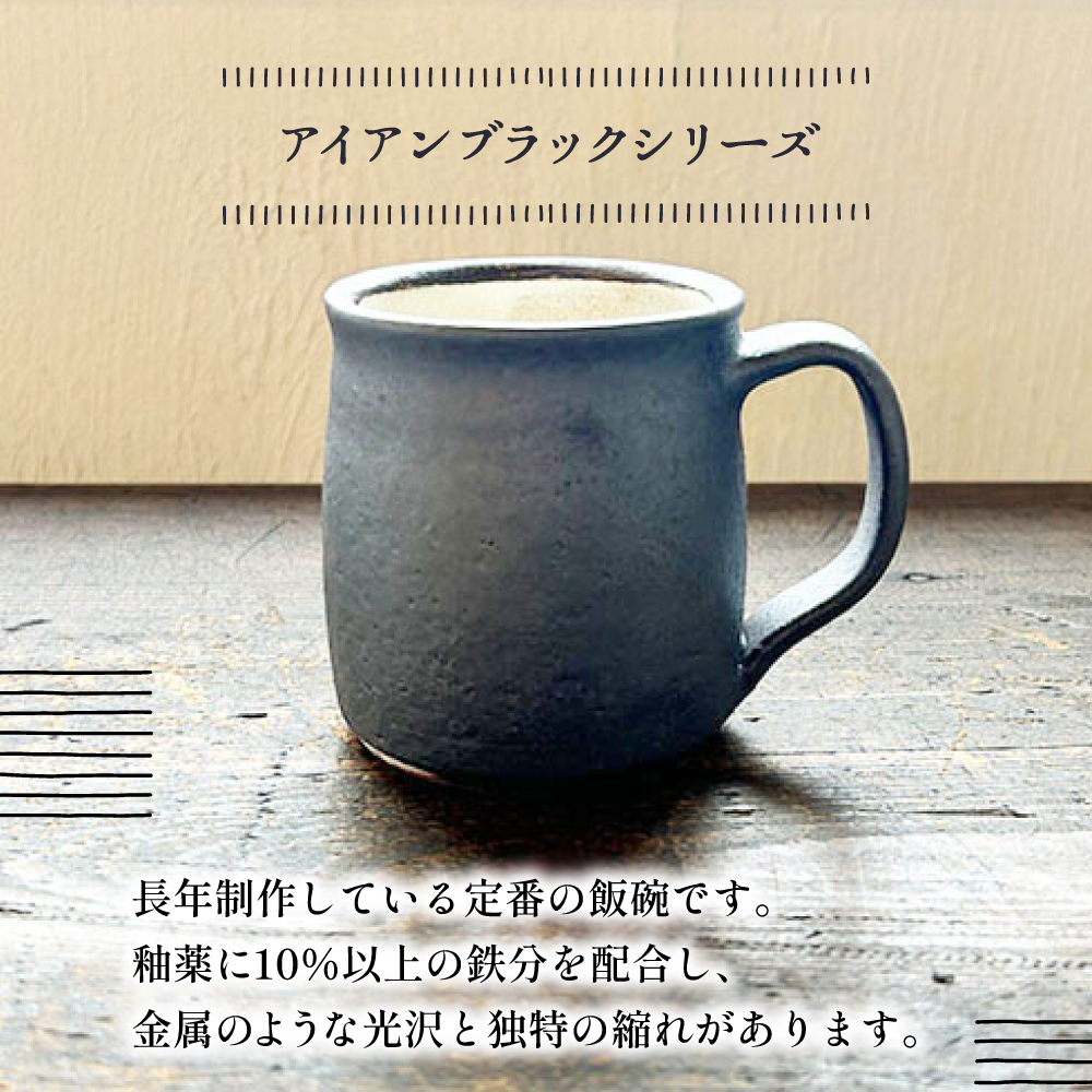 釉薬に10%以上の鉄分を配合し、金属のような光沢と独特の縮れがあります。また、器内部は光沢のある粉引にしていますので、飲み物の色がわかりやすいです。