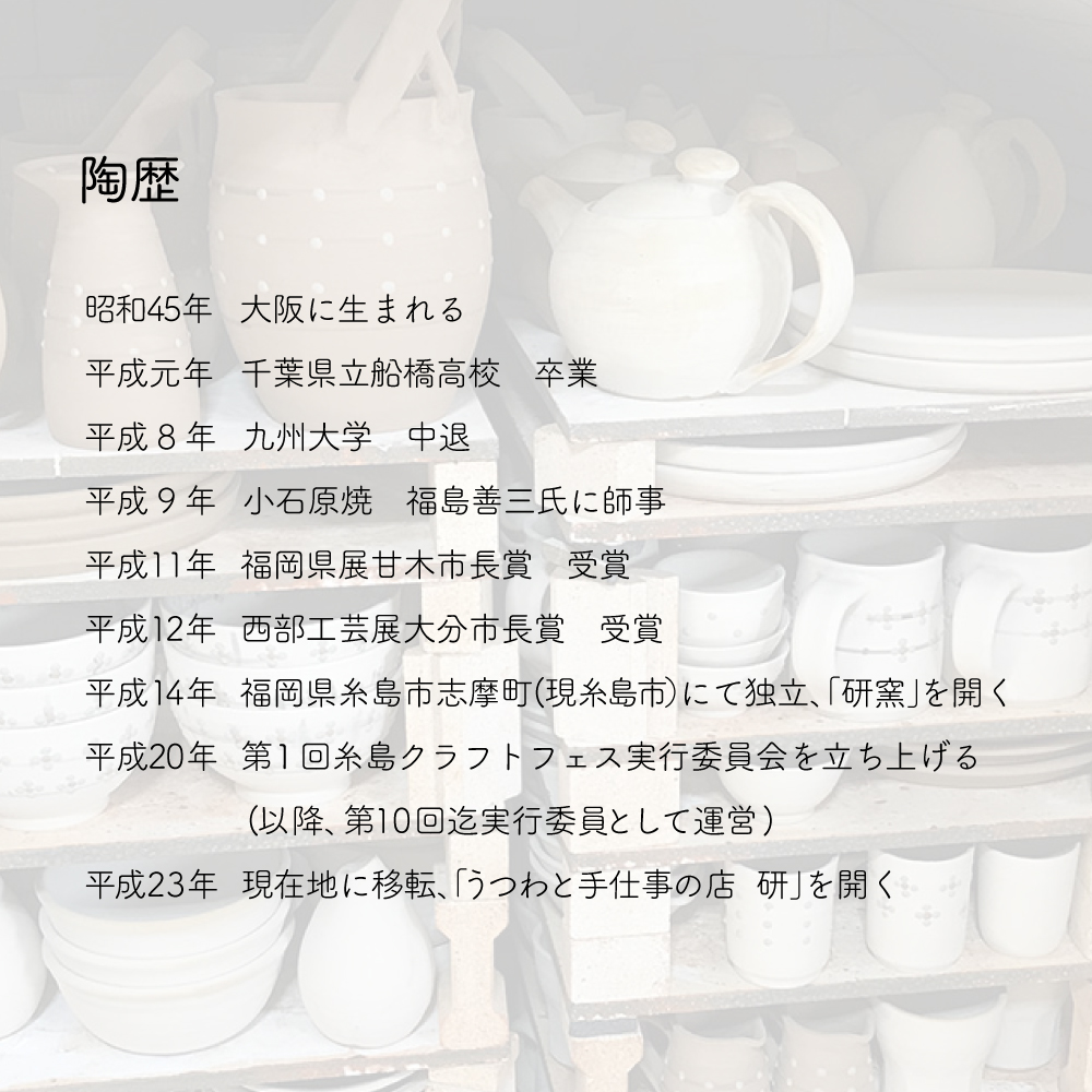 平成23年より現在地にて、「うつわと手仕事の店 研」をオープンしました。 私たちが、全国の手作りですばらしいものを作っている作家と知り合い、刺激を受けていき、ぜひその方たちの作品を知ってほしいという思いから、このお店を始めました。ガラスや、布物、木工フェルトなど様々なジャンルの物を取り揃えて、展示しています。