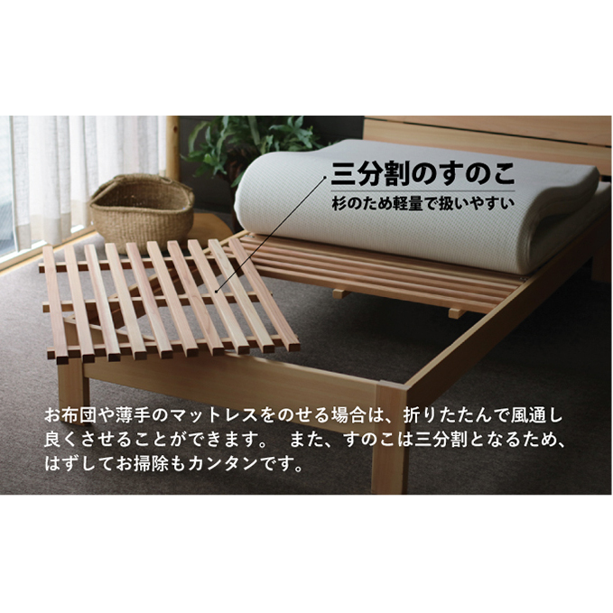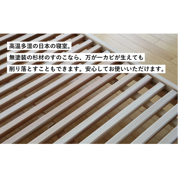 すのこは杉を使用。細かな杉の角材を細かく三分割に分け、取り外してベッドの下のお掃除ができたりと工夫されています。また、非常に通気性の良い構造になっております。