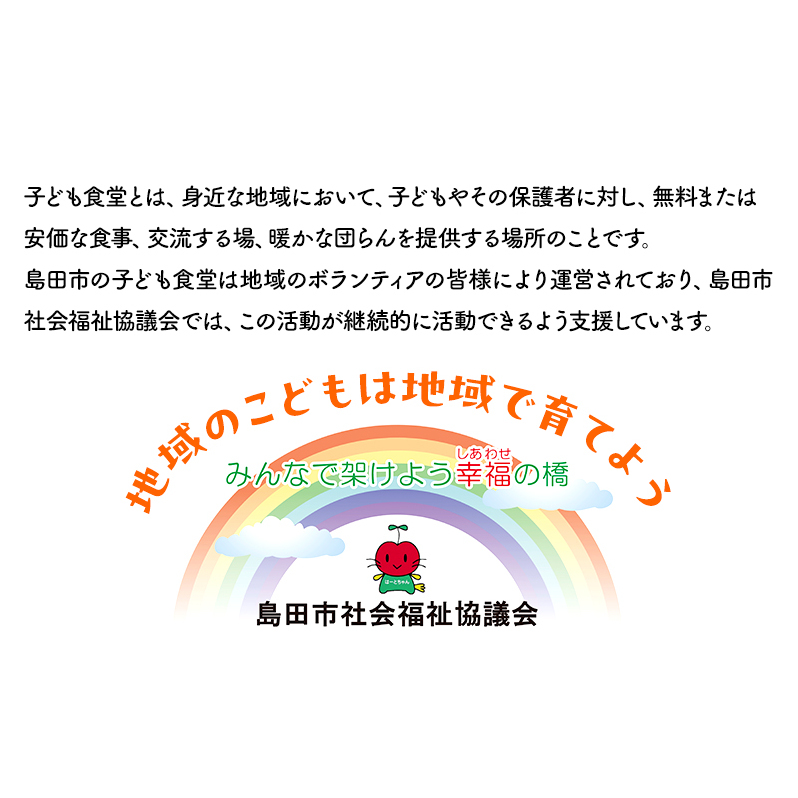 \地域のこどもは地域で育てよう/ 子ども食堂とは、身近な地域において、子どもやその保護者に対し、無料または安価な食事、交流する場、暖かな団らんを提供する場所のことです 島田市では、現在6カ所の子ども食堂が地域のボランティアにより運営されており、島田市社会福祉協議会では、この活動が継続的に活動できるよう支援しています。 みなさまの寄附金は、島田市内の子ども食堂への「応援金」として、子ども食堂運営団体で活用させていただきます。 子どもたちがキラキラした笑顔でこれからも過ごせるよう、みなさまからの温かいご支援をよろしくお願いします。 <島田html5-dom- document-internal-entity2-24066-end内html5-dom-document-i nternal-entity2-12398-end子html5-dom-document-internal-en tity2-12393-endもhtml5-dom-document-internal-entity2-3913> ・いなりなるちゃん食堂 ・はつくらこども食堂 ・あい愛カフェ ・ひだまりカフェCCキッチン ・おおつこども食堂 ・陽の気こども食堂 ・まごころ職人食堂 ・いけがやさんち 【申込期間】