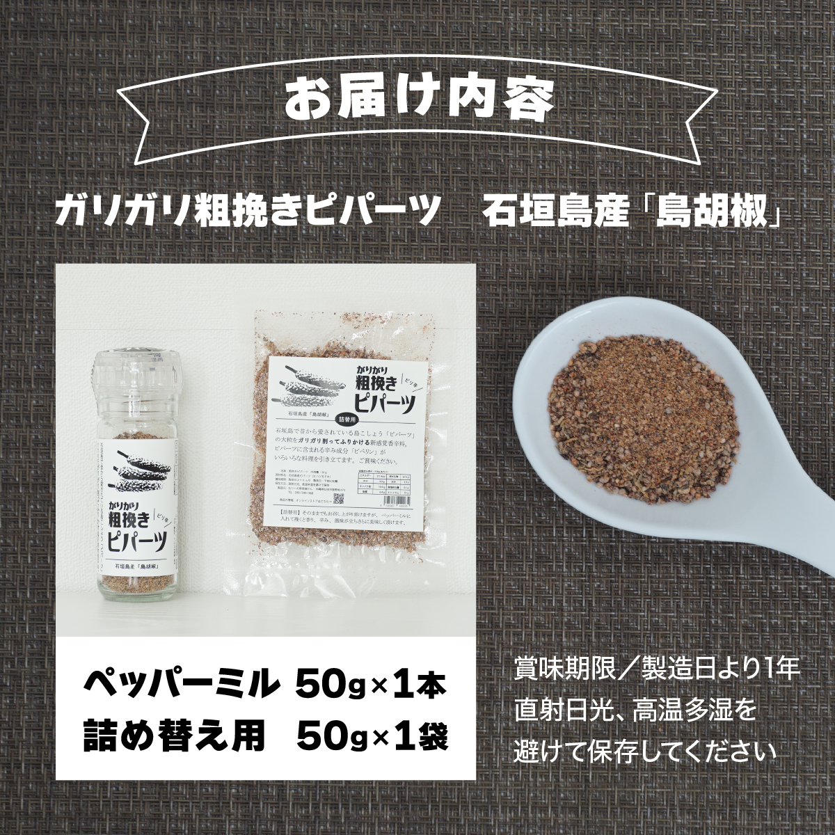 ガリガリ粗挽きピパーツ 石垣島産「島胡椒」ペッパーミル(1本)+詰替(1袋)| 沖縄 石垣 塩 調味料 香辛料 塩胡椒 胡椒 IN-01