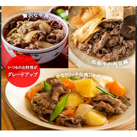 松阪牛を味わっていただく方法はいろいろありますが、「しゃぶしゃぶ」や「すき焼き」などの薄切り肉はお醤や味醂との相性が抜群です。最高級を堪能できる肩・肩バラスライス、さっと火を通しすぎずにお召し上がりいただくと松阪牛の芳香な香りをご堪能いただけます。 【主な使用部位】 肩、肩バラ