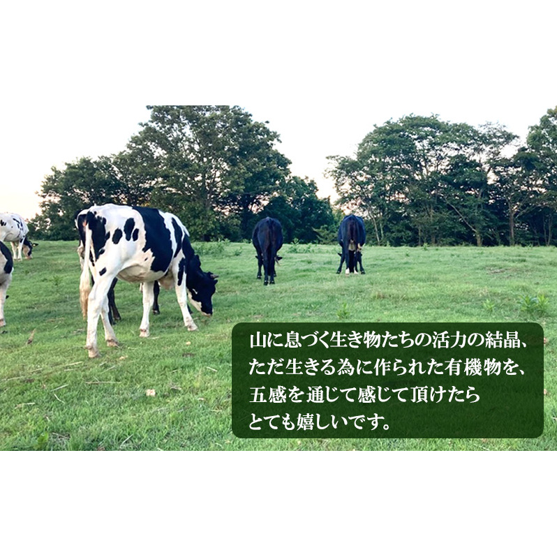 他所から牛や草を仕入れて投入すれば畜産業としては成り立ちますが、その土地に根付いて増えようとする生き物本来の活動に根差した牧場を作りたいと牛と共に挑戦して9年、本当に少量ですがこうして世に出せる分の生産ができるようになってきたのは、牛自身の厳しい環境に生きづこうとする懸命の努力の成果であり、山の環境も少しづつ変化し牛が生きるのを許容してくれた調和のあらわれだと感じています。山に息づく生き物たちの活力の結晶、ただ生きる為に作られた有機物を、五感を通じて感じて頂けたらとても嬉しいです。