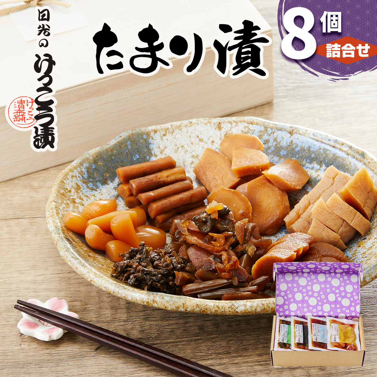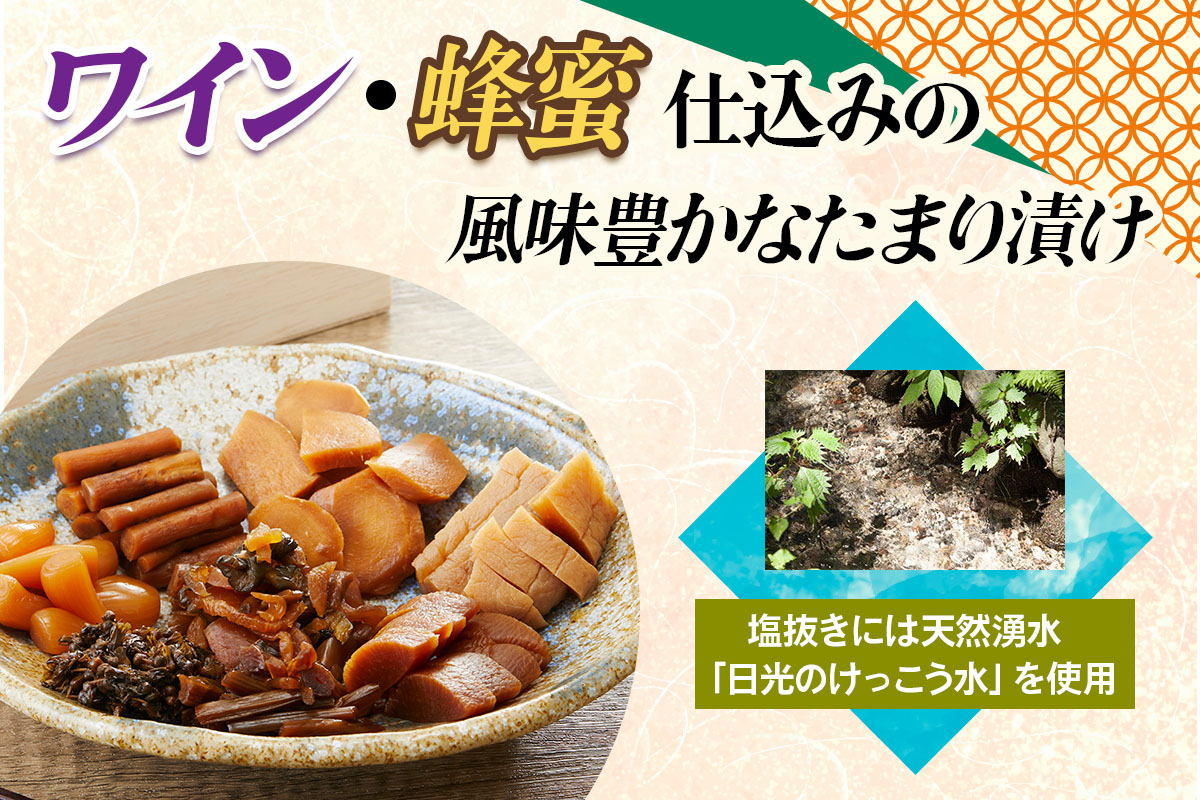 日光のけっこう漬は、塩漬した原料を塩抜きし、ワイン、クローバー蜂蜜を加えた当社独自のたまり醤油にじっくりと漬け込んだ、風味豊かなたまり漬です。