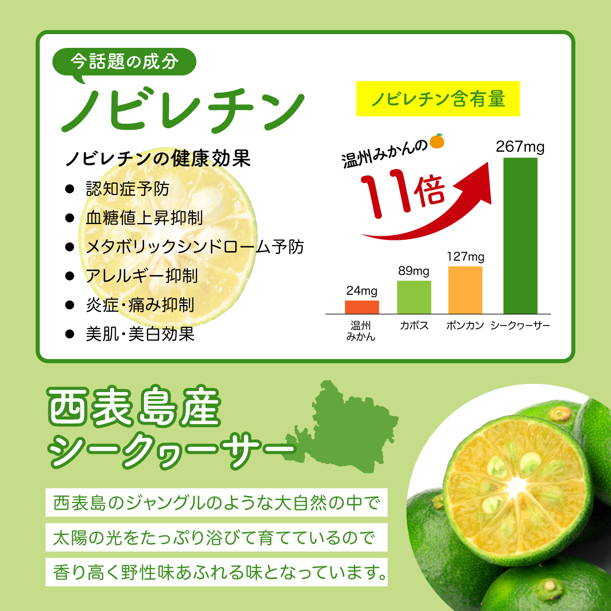 今話題の成分『ノビレチン』が豊富に含まれた青切りシークヮサーです。表面に多少のキズやボコボコがあります。西表島のジャングルのような大自然の中で太陽の光をたっぷり浴びて育てているので、香り高く野性味あふれる味となっています。レモンの代わりに料理に入れたり、お酒やジュースにしても美味しいです。袋や新聞紙に包んで冷蔵庫に入れて保存すると長持ちします。