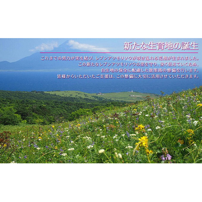 皆様からいただいたご支援は、新たなレブンアツモリソウの里を守り、永く伝えていくため、自生地の保全に配慮した散策路の整備大切に活用させていただきます。