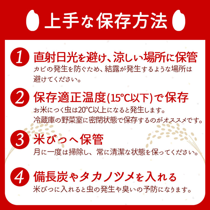 精米から1か月程度(高温多湿の場所を絶対に避け、冷蔵庫の野菜室などの冷暗所に保存してください)