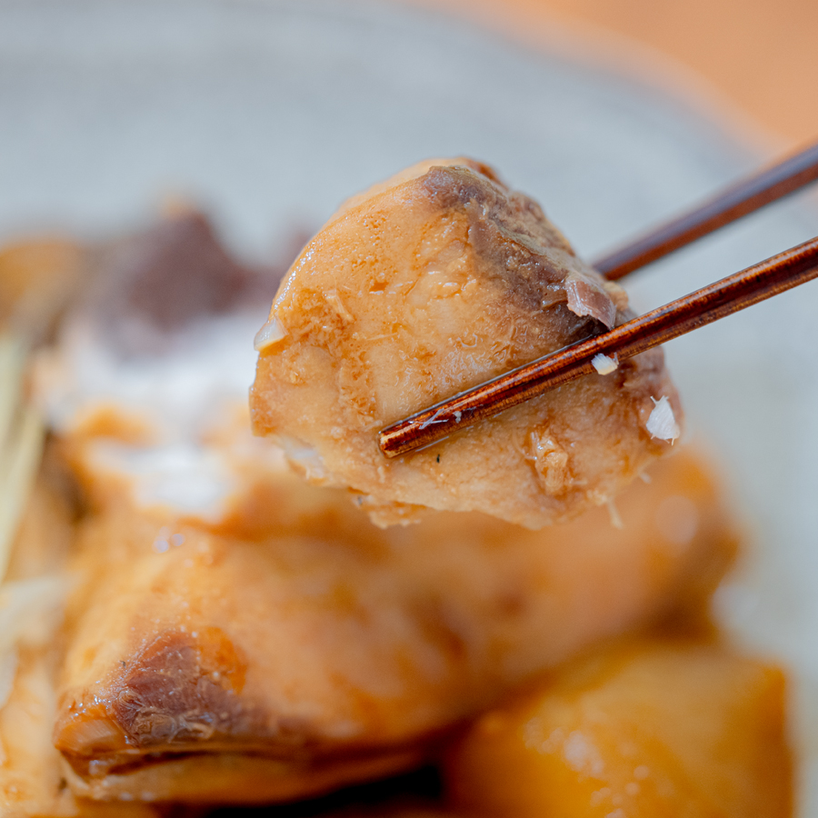 早朝に活け〆した自社養殖のブリを、宿毛市の自社加工場へと運び、国産大根と一緒に煮込みました。