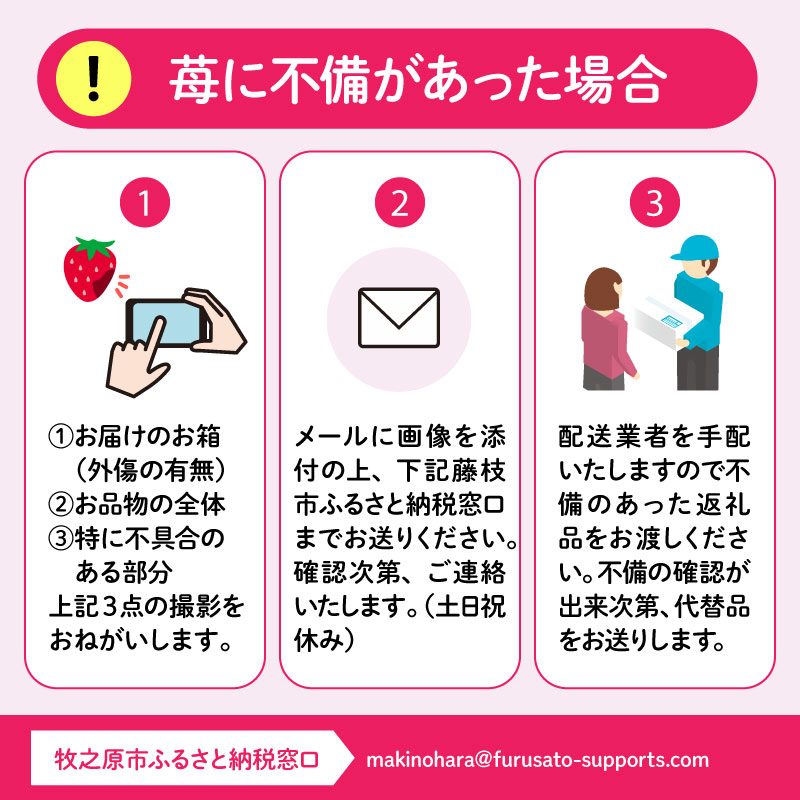 ※いちごは大変傷みやすく、傷つきやすい果物です。輸送中、傷付いたり傷んだりすることがございます。お受け取り後はすぐに状態の確認をしていただき、不備があった場合は破棄等はせず到着当日~翌日までに当市までご連絡をお願い致します。