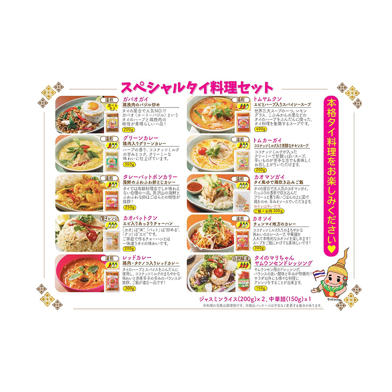 (1)ガパオガイ (200g)(湯煎商品)(2)グリーンカレー (300g)(湯煎商品) (3)トムヤムクン (200g)(湯煎商品)(4)トムカーガイ(200g)(湯煎商品)(5)カオパットクン (200g)※電子レンジ調理 (6)タレーパッポンカリー (250g) (湯煎商品)(7)ガイヤーン(約150g)(8)タイのマリちゃん ヤムウンセンドレッシング(9)カオマンガイご飯+お肉 (300g)(湯煎商品)(10)カオソイ (300g)(湯煎商品)(11)レッドカレー(300g)(湯煎商品)(12)冷凍ジャスミンライス(200g)x2(13)中華麺(120g)